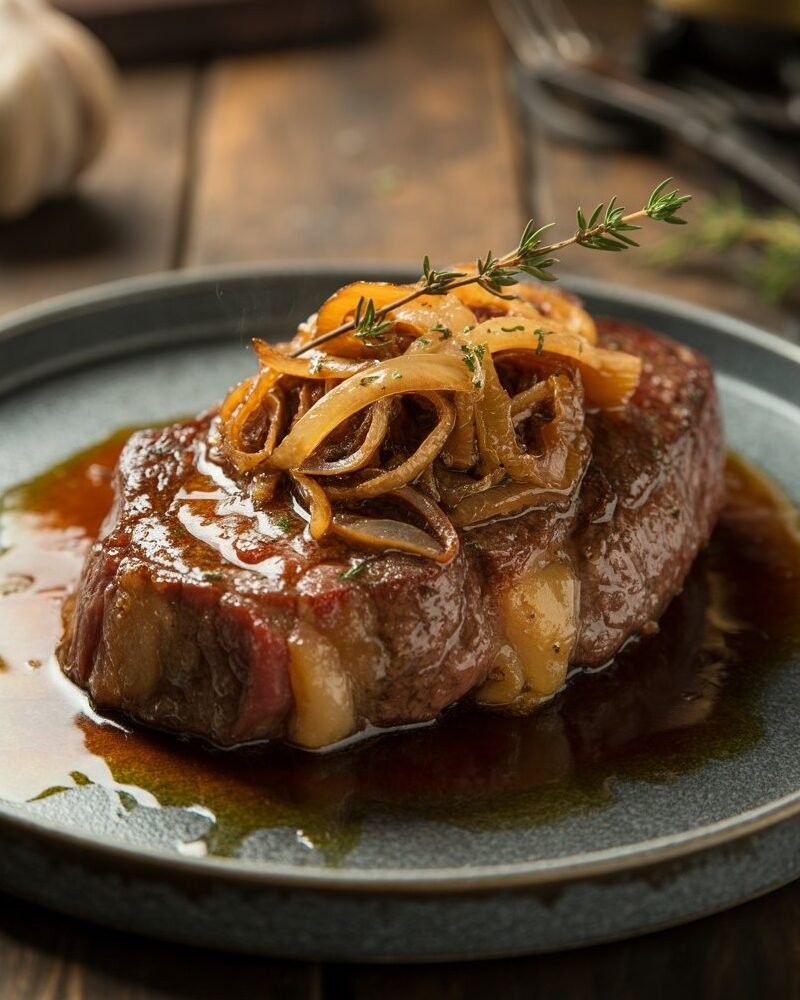 Set the steaks aside on a plate and give them 5–10 minutes to rest—this short pause lets the juices redistribute, locking in flavor and ensuring every bite is melt-in-your-mouth tender. Finish by topping each one with a hearty spoonful of caramelized onions..Crown each steak with a generous heap of caramelized onions, then serve right away while everything’s hot and bursting with flavor.